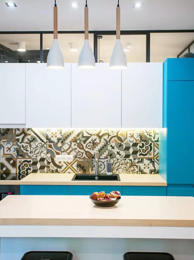 開(kāi)放式的廚房設(shè)計(jì)是小戶型的首選,加入花磚和藍(lán)色、白色的柜門(mén)設(shè)計(jì),有了燈光搭配便很好看。