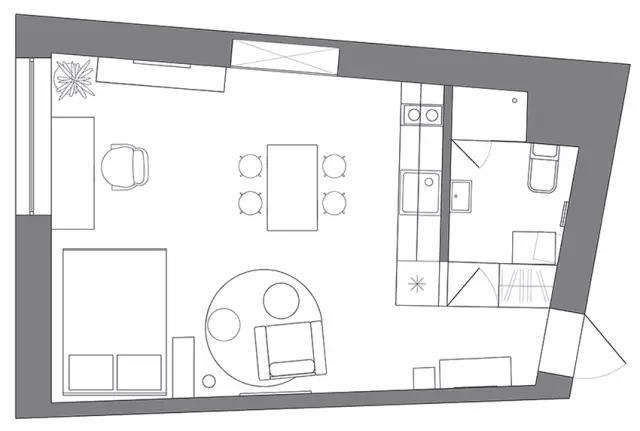 單身公寓的建筑面積為30㎡,不規(guī)則戶型,有些傾斜,也是一個(gè)大開(kāi)間,不好劃分格局。