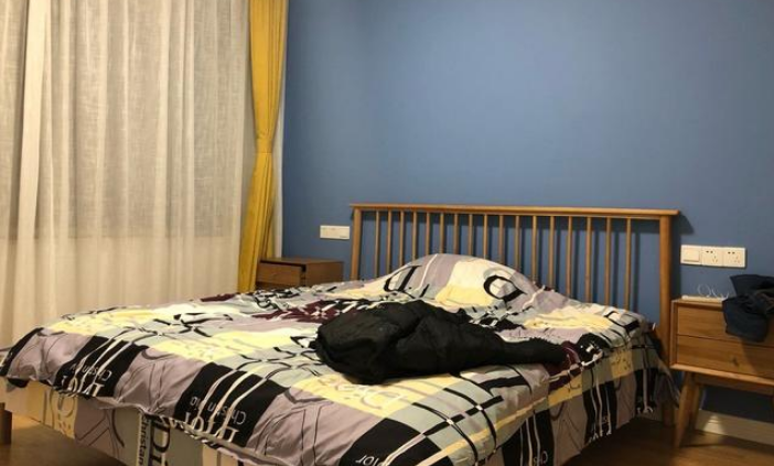 這是主臥,墻面刷了藍(lán)色硅藻泥,效果太漂亮了。頂面沒(méi)有做吊頂,走了一圈石膏線條代替,效果也很喜歡。床頭兩邊都放著床頭柜,可以提供一些儲(chǔ)物空間。床也很喜歡。