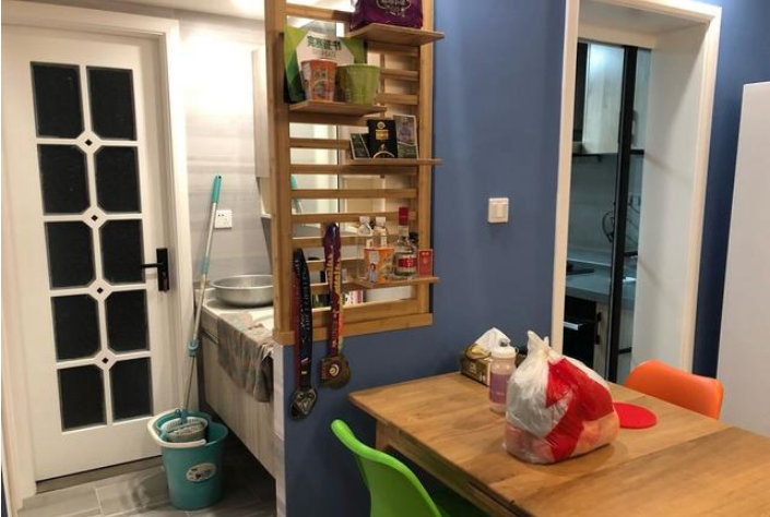 餐桌比較靠近衛(wèi)生間,浴室柜是分開(kāi)出來(lái)的,上面做了實(shí)木的隔斷,可以放點(diǎn)常用到的東西,很喜歡,而且也可以起到裝飾的效果。比較靠近衛(wèi)生間,一般衛(wèi)生間門都是關(guān)閉的,這樣就不影響啦。