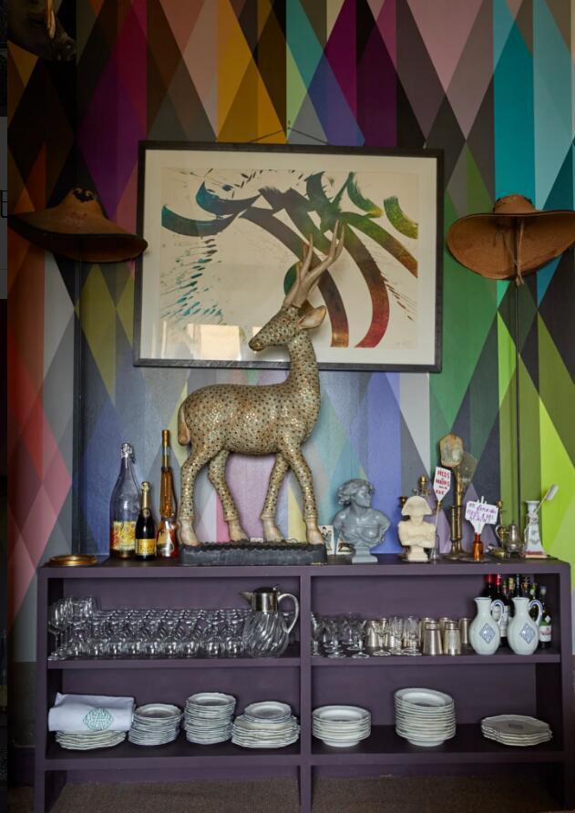 角落的柜子里還真是收納了不少小酒杯,擺放整齊,還樣式不一,逢年過節完全不用擔心酒杯不夠的問題。柜子上方的鹿像是在指引著我們,智慧而美麗。