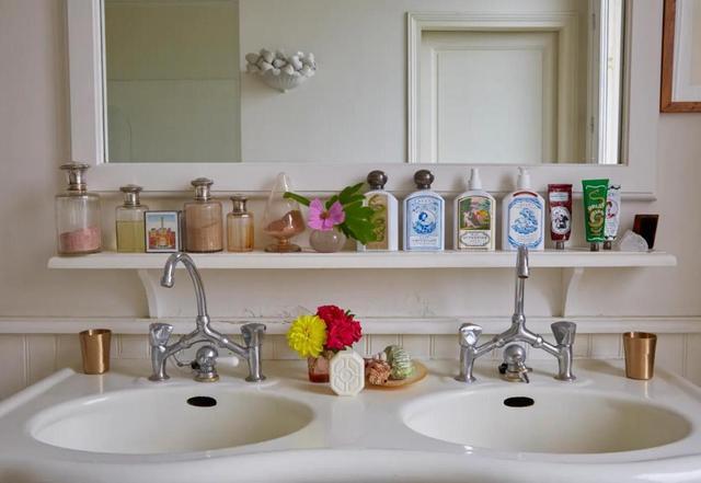 衛生間的洗手手盆竟然有兩個,這樣看來就不怕家里的2個寶寶搶著用啊,還在墻上裝了個隔板架,平日的洗漱用品也是足夠放了。