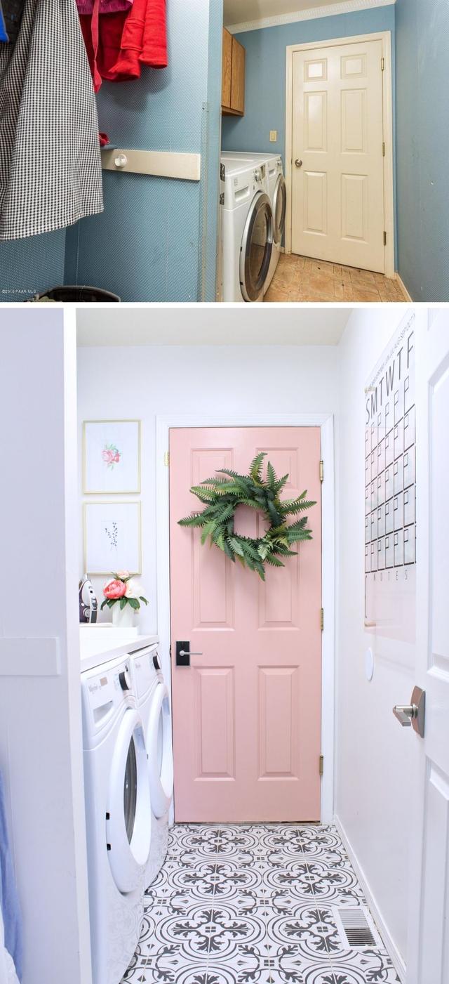 正如我們之前提到的,淺色調色板適合洗衣房,我們剛剛發現了一個支持這個想法的驚人例子。柔和的粉色門簡單精致,與地磚圖案、清脆的白色墻壁和微妙的金色調非常相配。綠色的花環也是一個非常棒的觸摸,使門的顏色和裝飾形成對比。你可以用各種不同的方法達到類似的效果。找到最適合你的組合