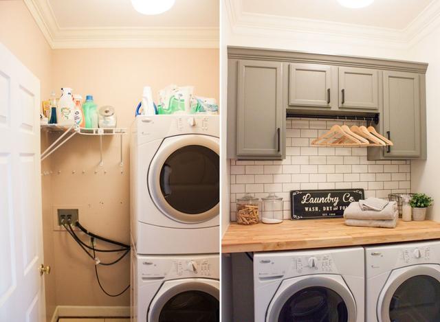 因為洗衣房通常都很小,所以正確的計劃和考慮所有的選擇是非常重要的。正如您在這里看到的,將它們并排放置是一個更好的選擇,允許在上面添加一個臺面、櫥柜和一個掛架。