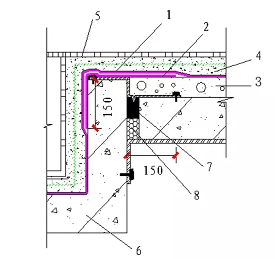 1—聚氨酯防水涂料(用量≤2.4kg/㎡);2—聚氨酯防水涂料附加層;3—填充層;4—剛性保護層(內襯鋼板網);5—面磚層;6—鋼筋混凝土結構層;7—密封材料密封;8—背襯材料