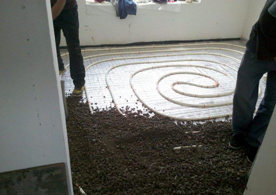 地暖回填混凝土墊層由水泥、大沙、直徑12mm以下的基石按照1:2:3的比例均勻攪拌后人工澆注而成,并用小型手提震動機震動多遍,使混凝土與管子之間密實接觸,確保熱量更高效的向地面傳導。由于地暖填充層的厚度直接影響到室內的凈高、結構的荷載和建筑初投資費用,因此填充層厚度不宜太厚。回填材料混凝土厚度應為30mm-40mm之間,干燥期過后可直接下一道工序的施工。