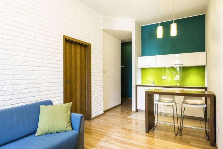 很多小戶型房屋一進門口就是客廳,在門口和客廳之間可以裝上一個飄動的簾子,展現情調的同時還能達到分隔作用??蛷d和餐廳之間可以用小型吧臺做過渡性的隔離。