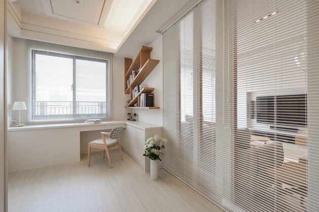 如果小戶型居室沒有足夠的面積將書房與臥室設計成獨立的兩個空間,可將它們合二為一使用,大大提高了空間利用率也增強了空間功能性。