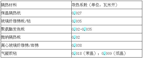 隔熱材料根據隔熱方式的不同可以分為:熱反射材料,反射系數高,通過將熱量反射出去達到隔熱的目的,如金、銀、聚酯等;多孔材料,材料本身多孔隙,利用空氣內導熱系數低的惰性氣體和空氣隔熱,如纖維、泡沫材料;真空材料,材料內部真空狀態,無法產生空氣對流,以阻隔對流來實現隔熱的效果。其中導熱系數低,比較具有代表性的幾種隔熱材料是: