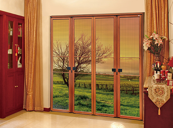 紗門一般采用的是折疊網,折疊網的工藝也很有講究,一般要選用18目網格的紗網,市面上很多都是14目的。還要選防水拒油性能高的。很多劣質的紗門風一大,網就會吹出軌道,所以紗門的防風性能也很重要。