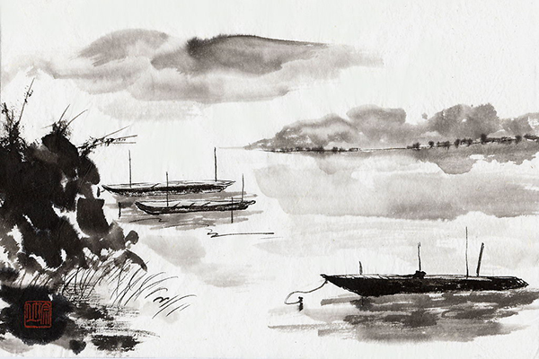 先用墨線勾畫出景物的大感覺,構圖注意重心。先落墨點出小山丘,一般起筆落墨為有濃淡的濕墨,接下來干筆走線條向外擴張,線條由簡到繁、由疏到密;最后加點、擦、皴。注意點擦時變化要多,以中鋒點、散鋒點、側鋒擦,營造出山村郊外的蒼野和自然,主題不斷的深入,使畫面更加豐富多彩。