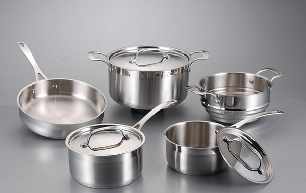 3、不銹鋼鍋具外觀漂亮、結構精美,同時又具有耐用、耐腐蝕、防銹、易加工、不變形等優點,是炊具市場的主流產品。但不銹鋼鍋具導熱不均勻,所以許多品牌的不銹鋼鍋采用了三層復合底結構,有的品牌還采用了通體三層復合結構。三層復合結構一般是兩層不銹鋼夾一層鋁,以高科技工藝一次成型,使鍋具受熱均勻、導熱快,不會因鍋內單點溫度過高而燒焦食物,也不易產生油煙,一般具有煎、炒、烤、燉等多種功能。使用三層復合結構的鍋具,既能充分保持食物的營養成分,又可最大限度地維護家庭主婦的身體健康。