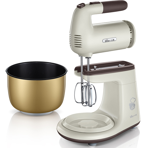 這種其實就是在手提款的基礎上加個底座,上面放個可旋轉的攪拌桶,這樣即方便又省力。一般帶桶的打蛋器能夠和面的話性價比就比較高,如小熊底座式打蛋器,可以打蛋也可以和面。打蛋的時候可以分離開來,變成手提電動打蛋器。一般為300-500W功率。購買這類打蛋器時,建議不要選擇過于便宜的機型。一般來說價格在150-300元左右。
