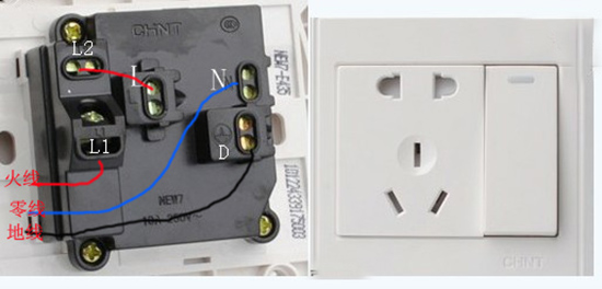 3 開關(guān)控制該插座: 火線接開關(guān)上的L1,火線輸出一端接L2(開關(guān)的輸出端),另一端 接五孔插座的L,零 接五孔插座的N,接地保護線接五孔插座的D 。