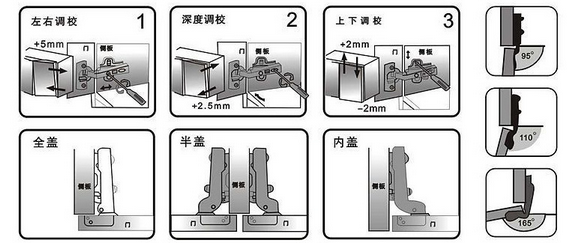 一般彈簧合頁主要都是個在柜子上的,它一般要求板的厚度在18到20mm,從材質(zhì)上可分為:鍍鋅鐵、鋅合金。從性能上可分為:需開孔和不開孔兩種。不開孔就是我們常見的橋式鉸鏈,其外形像一座橋而得名,其優(yōu)點(diǎn)在于無需在衣柜門打孔,并且不受樣式的限制,規(guī)格有大、中、小三個型號。需開孔:用在柜子上的彈簧鉸鏈,它的特點(diǎn)是門板必須要打洞,門的式樣受鉸鏈的限制,門閉合后不會被風(fēng)吹開,無需要再安裝防撞裝置,其中又分為可脫卸和不脫卸式的合頁之分。脫卸式,安裝方便,拆卸靈活,門隨意艾比任何角度都能定位,使用壽命長。