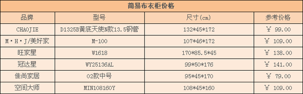 簡易布衣柜根據(jù)其材質(zhì)、結(jié)構(gòu)、尺寸等不同,價格也不一樣,通常小尺寸的價格在100元左右,好一點的一般在200-400元左右。下面簡單羅列一下某些品牌、型號的產(chǎn)品價格,僅供參考。
