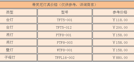 蒂芙尼燈具是世界著名的燈飾品牌,融合了精湛的現代工藝和古典的高雅之感,有著優雅不凡的品味。蒂芙尼燈具是將彩色玻璃按設計圖稿手工切割,經研磨后用銅箔包邊,再用錫按圖案焊接起來,全程手工制作,質量好,制造工藝精細,因此價格在國內來說相對較昂貴。