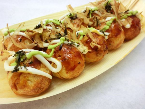 原料配料:章魚丸粉、海鮮醬、甜味醬、沙拉醬、芥末醬、辣椒醬、柴魚片、脫水春蝦、脫水章魚、脫水海苔、時令蔬菜等