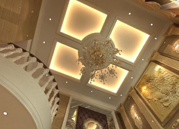 歐式吊頂多為圓形,或者是周圍是不規(guī)則矩形,內(nèi)部有一遞進的圓形在其中。