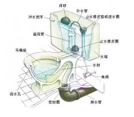抽水馬桶由以下主要部分組成:進水管、出水管、滲水管、水塞(進水和出水)、浮球、放水旋鈕及杠桿。一定要弄清以上各部件在工作中的作用。