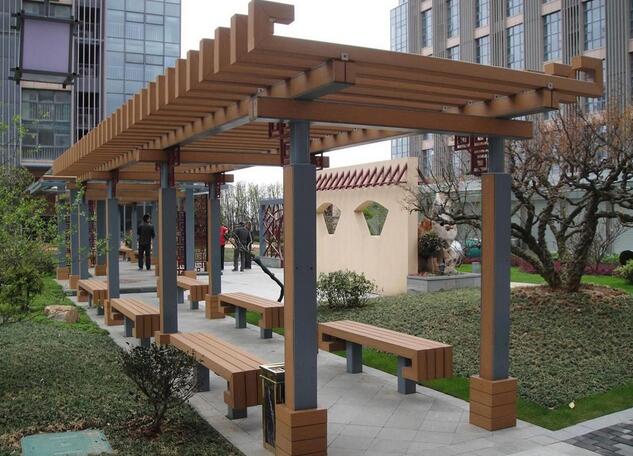 (1)廊架的設計要實現供行人遮陽、遮雨和小憩、引導人流和視線,連接主體建筑或景觀節點的作用。