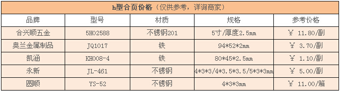? ? ? ?h型合頁規(guī)格尺寸(長×寬)主要有:2寸×1.5-1.8寸、2.5寸×1.7寸、3寸×2寸、4寸×3寸、5寸×3-3.5寸、6寸×3.5-4,注:寸指英寸,1寸=25.4mm。