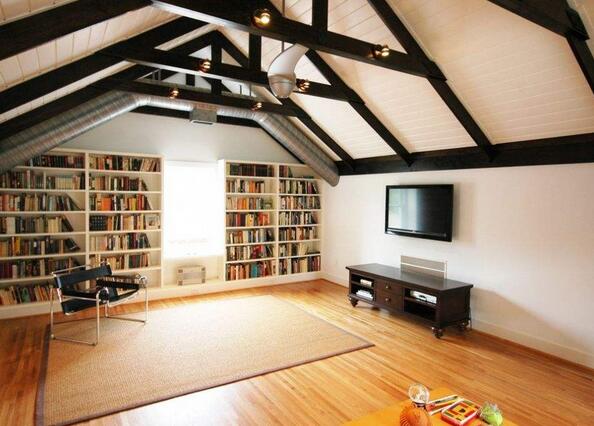 閣樓書房可分為閱讀區、藏書區、學習辦公區、休閑區,如果面積并不是很大的話,應保留基本的學習辦公區和藏書區。如果面積夠大的話,還可以分成其它的區域,充分利用閣樓空間。