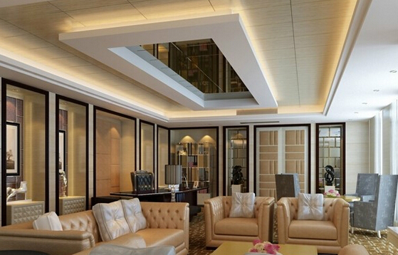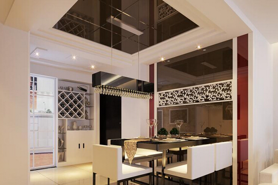 玻璃可以起到延伸空間的作用,對(duì)于層高比較低的空間,選用這種吊頂可以減少壓迫感,加上材質(zhì)的反光性以及燈光的配合,可以渲染空間的氣氛。