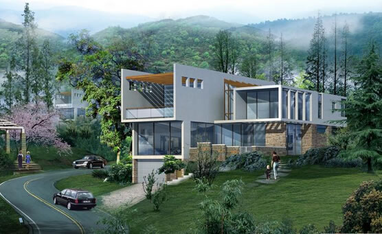 5、山地別墅在設計創意上是生長型建筑。先有環境,再有建筑。在建筑結構、布局、景觀朝向上都結合自然地勢。要求設計師在設計上結合模擬自然景觀。