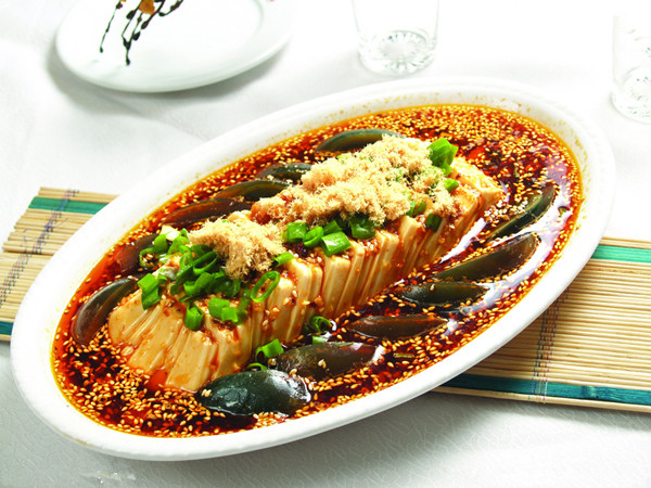 4、用大火把油燒熱,倒入蒜頭爆炒出香味,把熱油、蒜頭一起澆在皮蛋、豆腐上,撒上肉松。