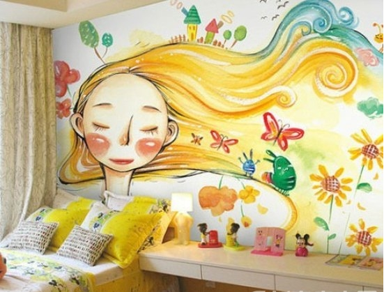 搞怪圖案背景墻搭配點評:顏色的搭配和形象的創造,使空間更受女生的青睞,臥室顏色統一,主題鮮明,使空間更加活潑。