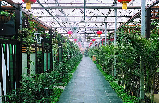 綠色生態餐廳完全按照標準溫室的結構建造,多采用文洛式,覆蓋材料多為PC板或者玻璃,結構保溫性能好,整齊規范,室內各個空間溫度均勻,有利于景觀植物的生長,鑒于餐飲布局的需要,在文洛溫室結構的基礎上,可進行局部調整。